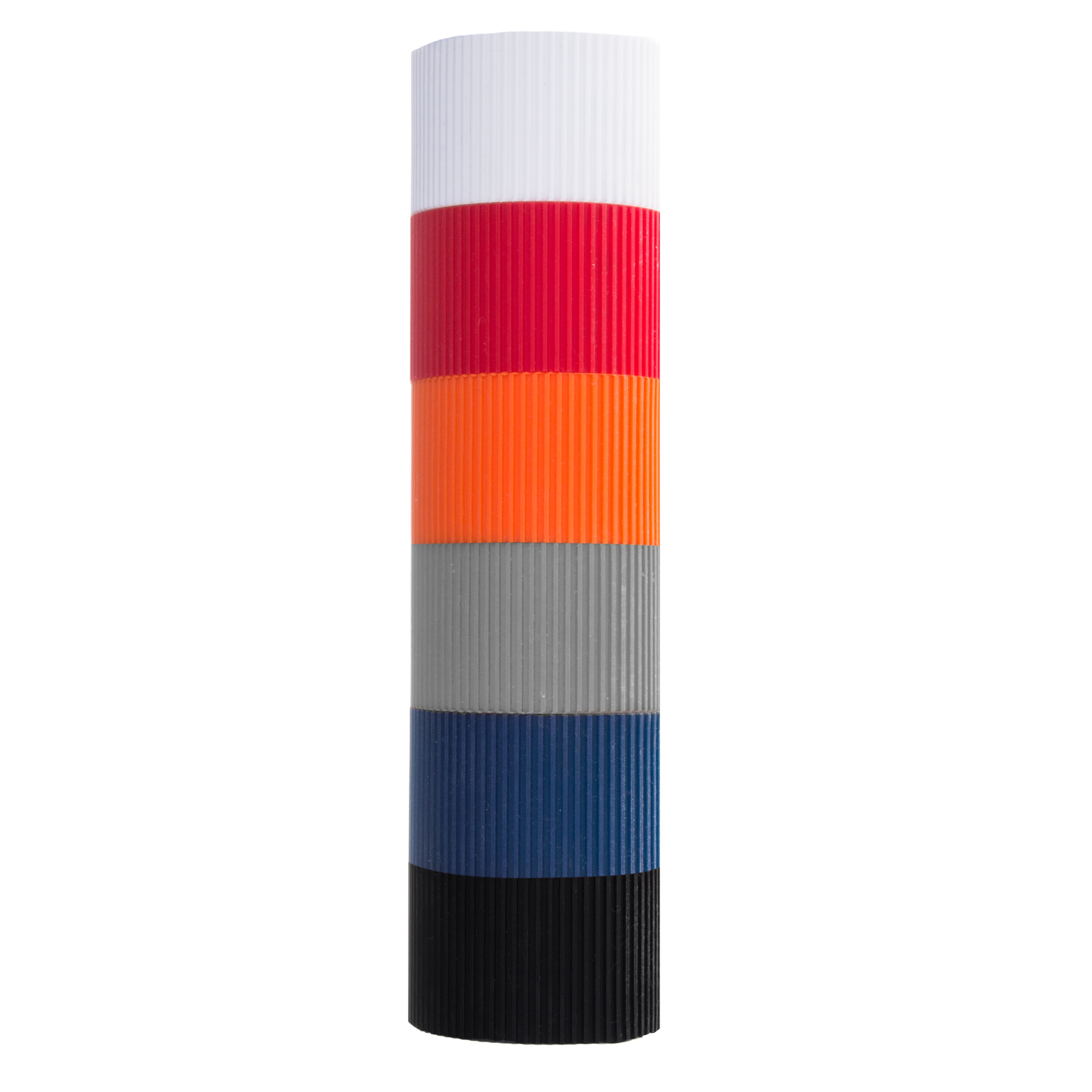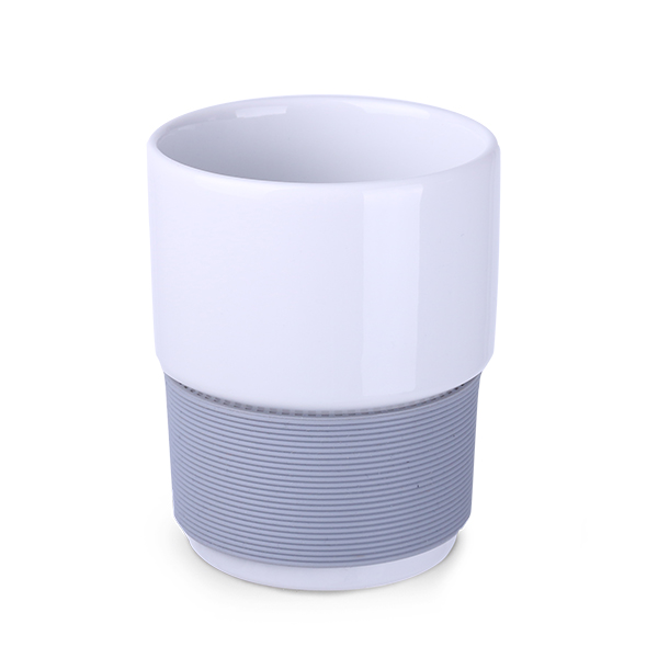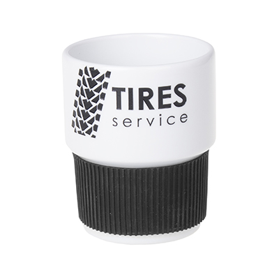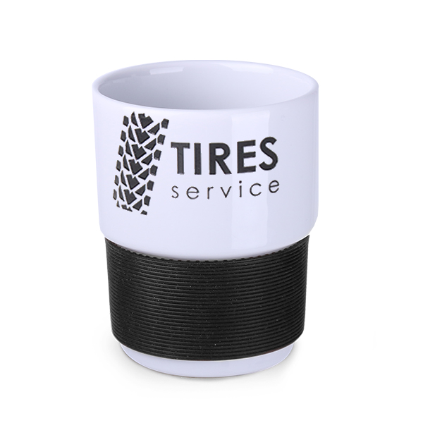 Mittelgroßer Werbebecher aus Porzellan ohne Henkel. 40 mm breite Bänder, erhältlich in 7 Farben: weiß, orange, rot, grün, marineblau, braun und schwarz.