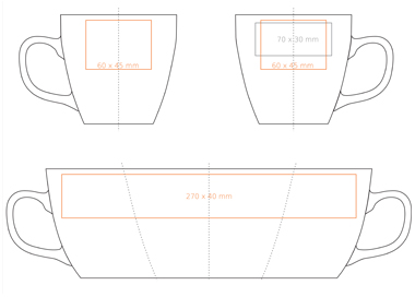 Auf dem Tassengriff Auf der Innenwand Auf dem Boden innen Aufdruck von unten Mit einem Streifen Druck auf konvexe Formen Handarbeit - Einfärbung des Randes Personalisierung |