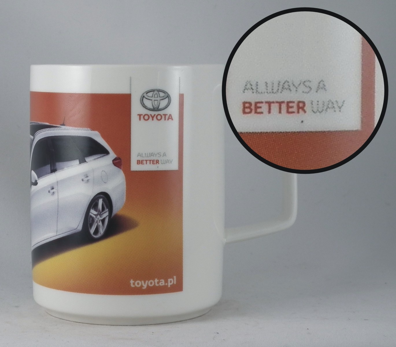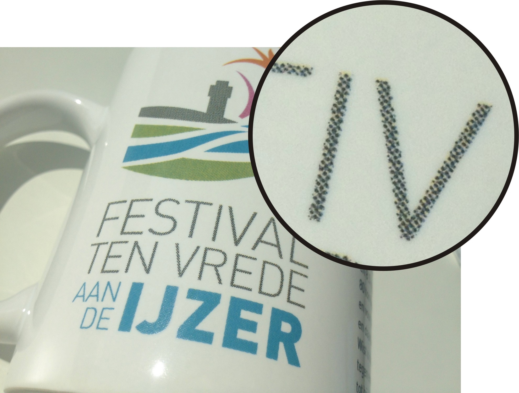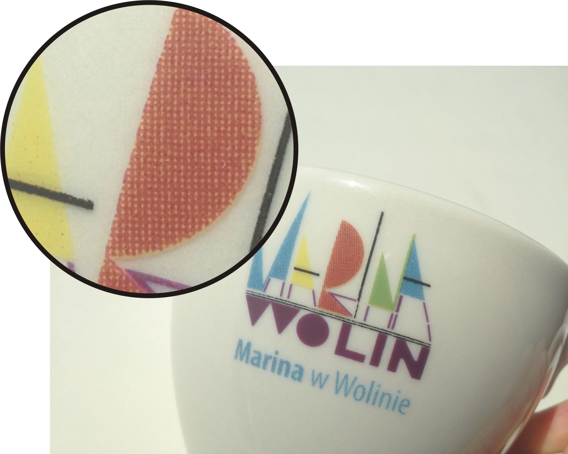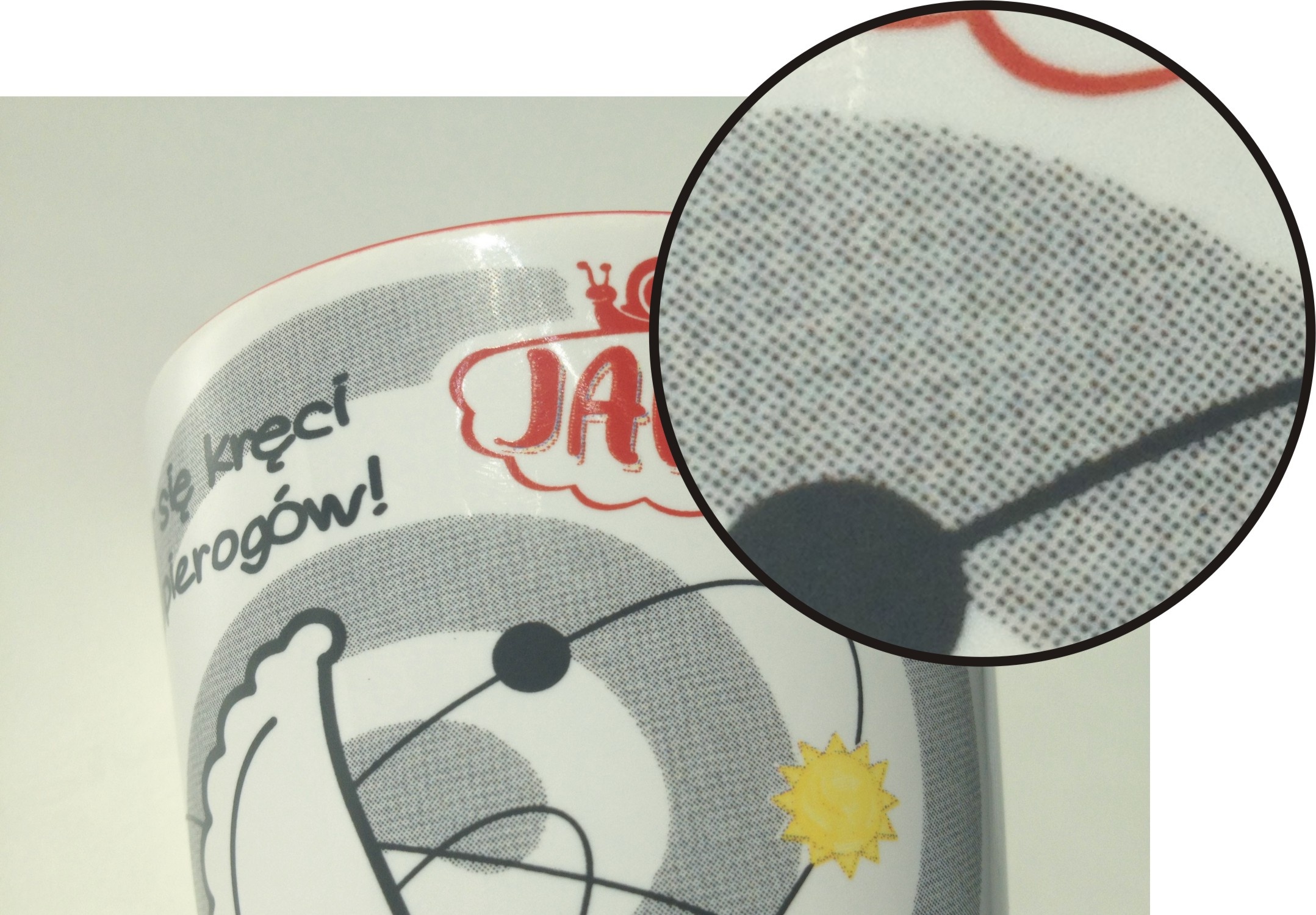 Auf Bechern mit CMYK-Druck sind die Rasterpunkte sichtbar (besonders bei Nahansicht). Bei Drucken auf große und homogene Flächen sind diese Punkte besonders sichtbar.